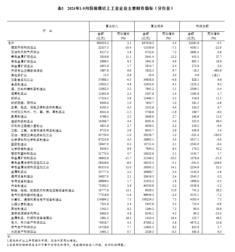 1—9月份,采礦業(yè)實現(xiàn)利潤總額8963.8億元,同比下降10.7%;制造業(yè)實現(xiàn)利潤總額37325.0億元,下降3.8%;電力、熱力、燃?xì)饧八a(chǎn)和供應(yīng)業(yè)實現(xiàn)利潤總額5992.9億元,增長12.1%。