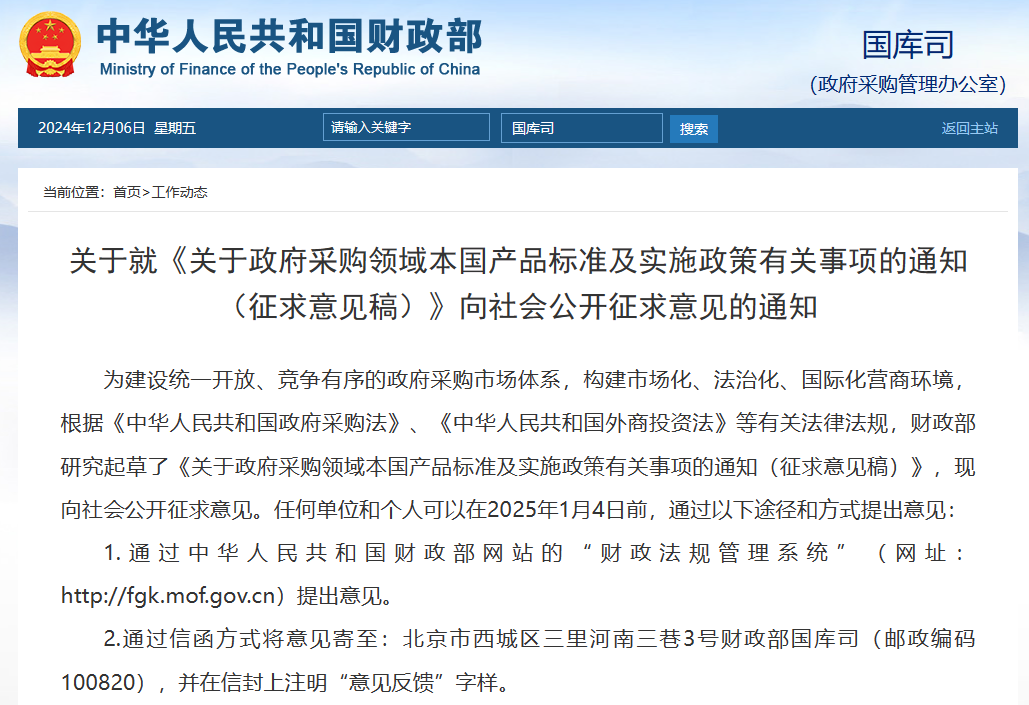 近日,財政部在其官方網站上發布了《關于政府采購領域本國產品標準及實施政策有關事項的通知(征求意見稿)》,并向社會各界公開征求意見。該通知旨在構建統一開放、競爭有序的政府采購市場體系,保障各類經營主體平等參與政府采購活動,并明確提出在政府采購活動中,給予本國產品相對于非本國產品20%的價格評審優惠。